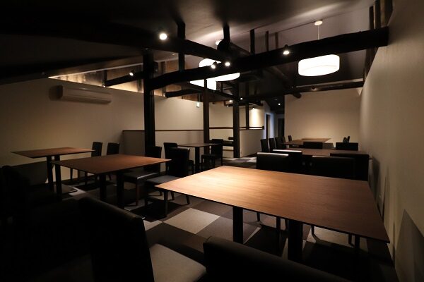 2階客席は既存の土壁や梁を活かした高い天井の大空間にテーブル席となっております。